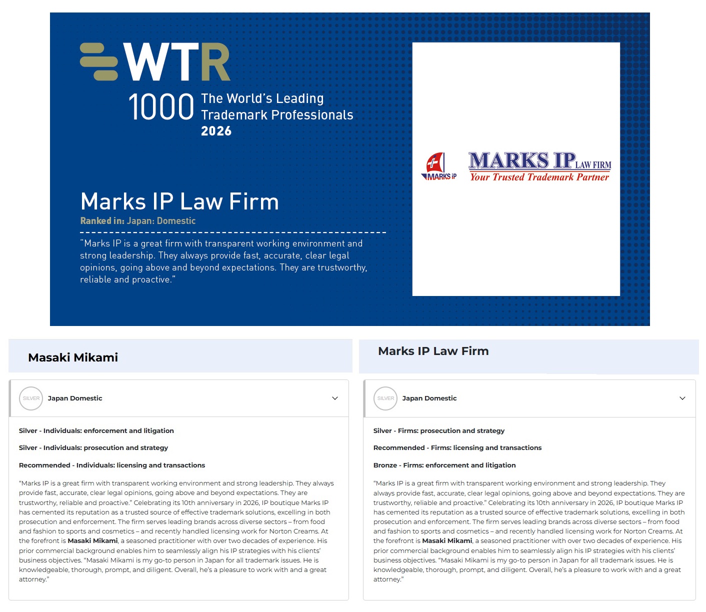We are extremely proud that the acclaimed “WTR 1000 – The World’s Leading Trademark Professionals” annual list in 2026 ranks: MARKS IP LAW FIRM in “Bronze” band for firms in Japan for enforcement and litigation, and “Silver” band for prosecution and strategy, and being recognized as recommended firm for licensing and transactions, and our founder, Masaki Mikami in “Silver” band for individuals in Japan for both enforcement and litigation, and prosecution and strategy, as well as being recognized as recommended individual for licensing and transactions for two consecutive years.